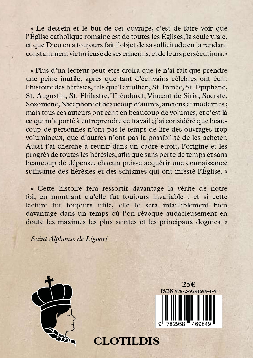 Réédition du livre de saint Alphonse de Liguori où saint Alphonse nous donne un condensé de l'histoire de l'Église face aux hérésies qu'elle a du affronter et où elle est sortie systématiquement vainqueur.
